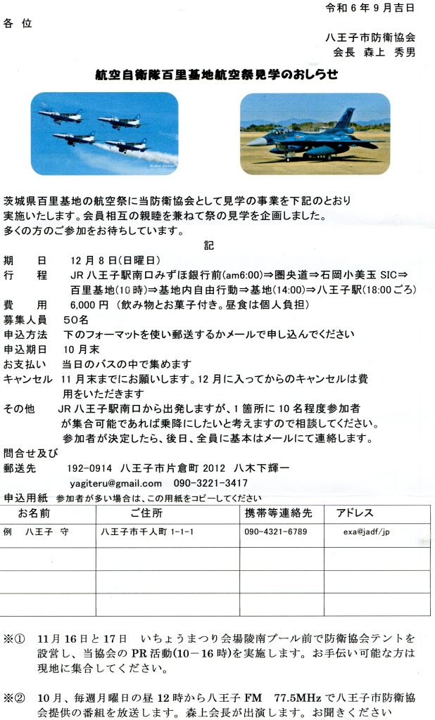 八王子市防衛協会におきましては、来る2024年12月8日(日)に航空自衛隊百里基地の航空祭を見学するバスツアーを企画しました。募集人員は50名です。郵送かメールにてお申込みください。