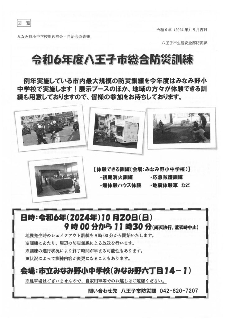 八王子市で最大規模の総合防災訓練が、2024年10月20日(日)09:00~11:30に八王子市立みなみ野小中学校で行われます。体験できる訓練は①初期消火訓練、②応急救護訓練、③煙体験ハウス体験、④地震体験車などです。【八王子市防災課】042-620-7207