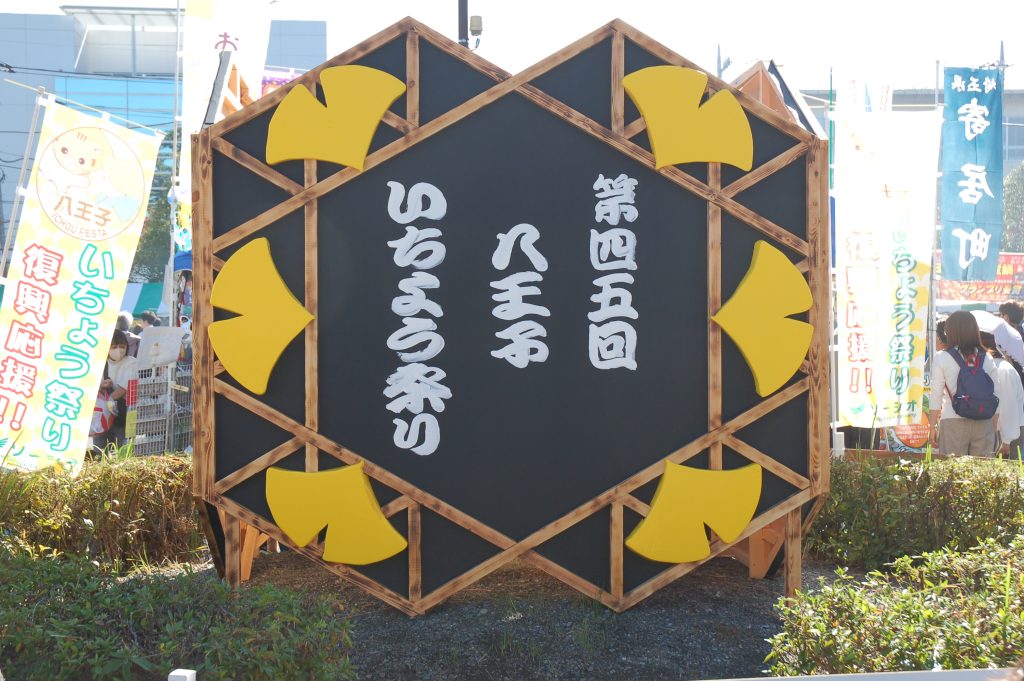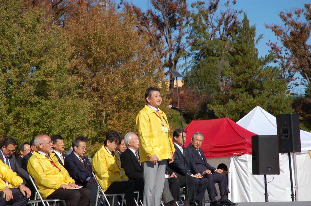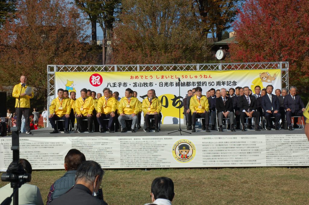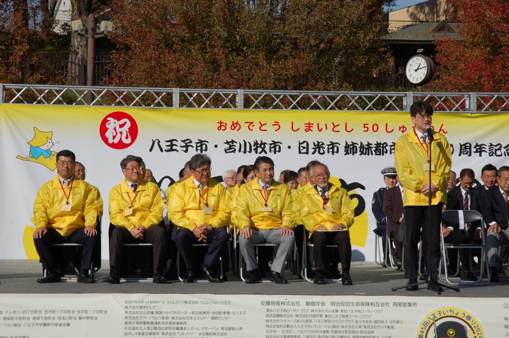 いちょう祭りのセレモニーでは、八王子市・苫小牧市・日光市姉妹都市盟約50周年記念の式典が行われました。苫小牧市長に苫小牧市議会議長、日光市長に日光市議会議長がご臨席になられておいででした。はぎうだ光一代議士から「そもそも、いちょう並木は大正天皇の多摩御陵の参道を整備するために始められた」とのご挨拶がありました。