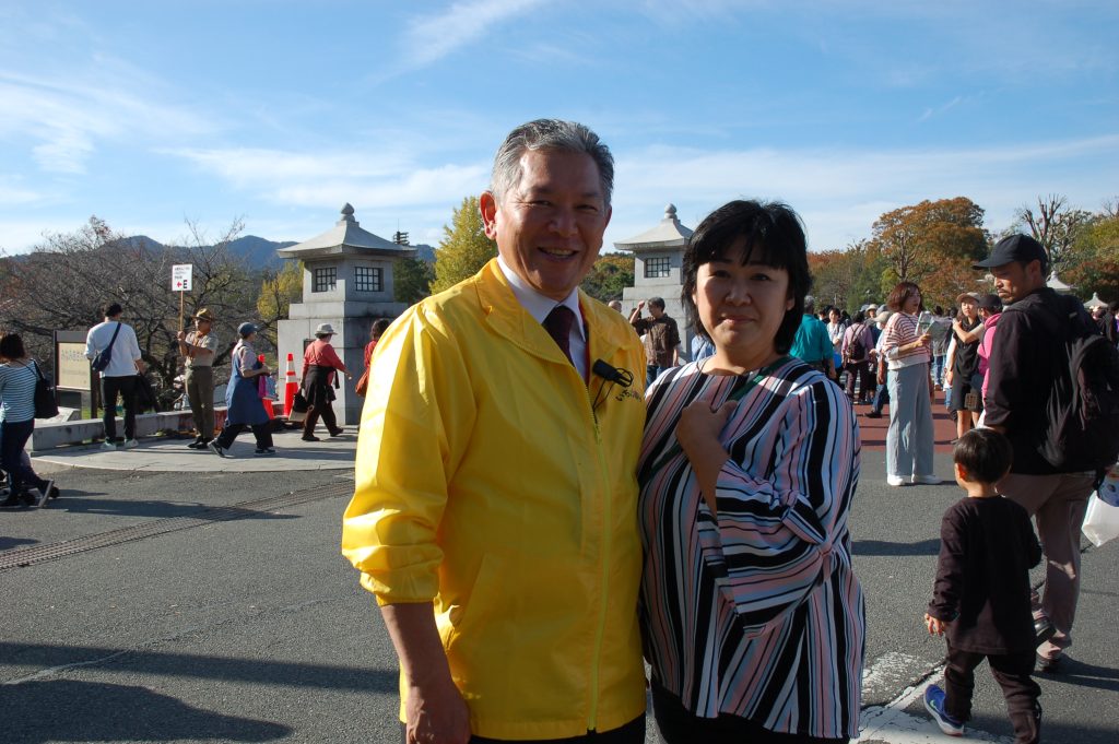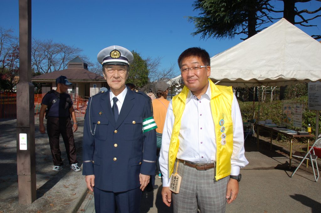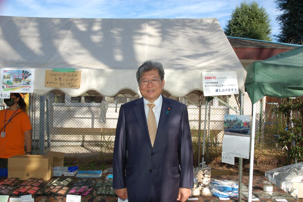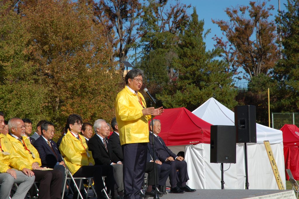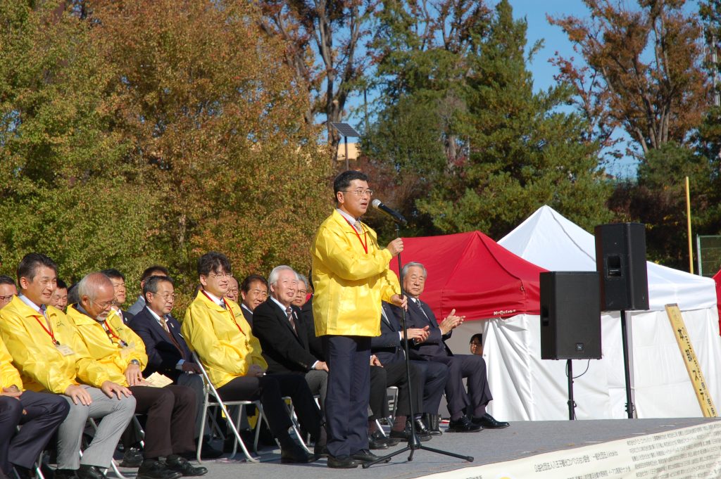 いちょう祭りのセレモニーでは、八王子市・苫小牧市・日光市姉妹都市盟約50周年記念の式典が行われました。苫小牧市長に苫小牧市議会議長、日光市長に日光市議会議長がご臨席になられておいででした。はぎうだ光一代議士から「そもそも、いちょう並木は大正天皇の多摩御陵の参道を整備するために始められた」とのご挨拶がありました。