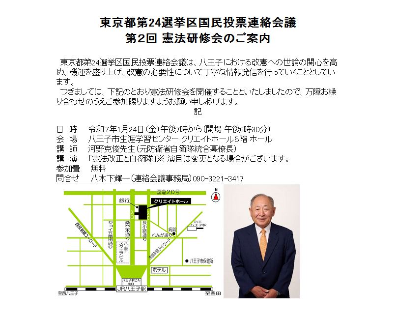 令和7年1月24日(金)午後7時より(開場 午後6時30分)八王子市生涯学習センター クリエイトホール 5階ホールにおきまして、東京都第24選挙区国民投票連絡会議の第2回となります憲法研修会を開催いたします。講師は、元防衛省自衛隊 統合幕僚長の河野克俊先生で、講演の演目は「憲法改正と自衛隊」です。参加費は無料でどなたさまでもご参加いただけます(定員170名)。