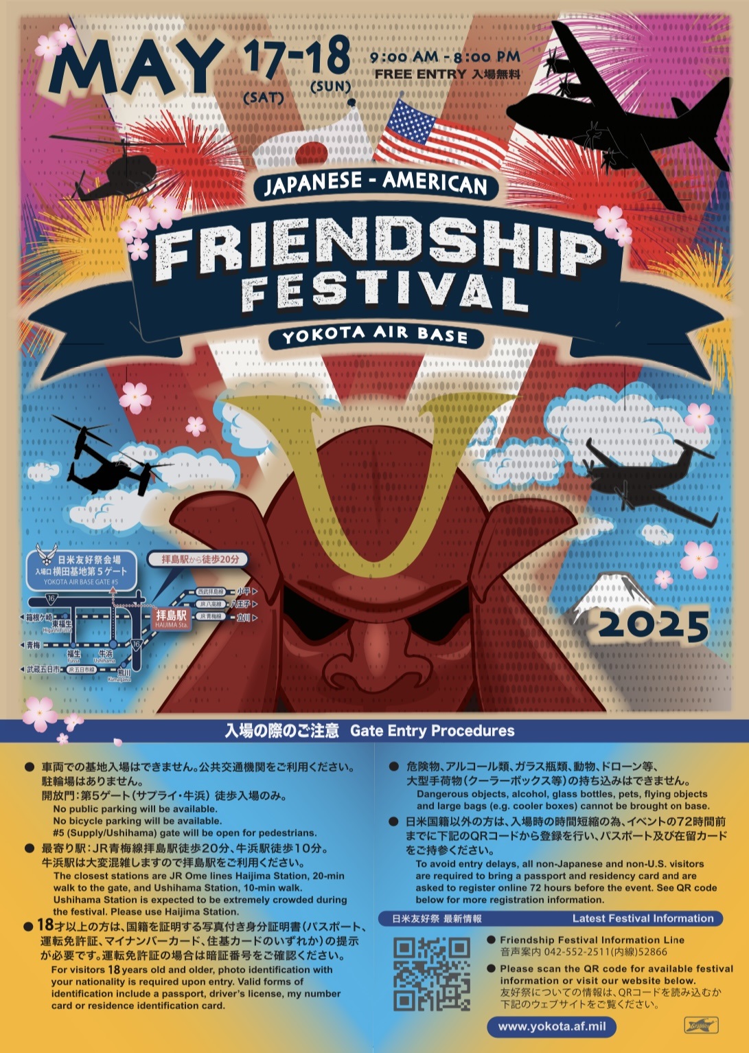 イベント告知2025年5月17日(土)・18日(日)に在日米空軍横田基地(東京都 福生市 福生2552)にて「在日米空軍 横田基地 日米友好祭2025 フレンドシップ・フェスティバル」が開催されます。基地を一般開放(9:00~20:45)して、航空機の地上展示、ステージイベント、飲食ブースなどが行われます。入場にあたりましては、運転免許証などの身分証明書が必要です。(画像の出展は、横田基地Facebookより)