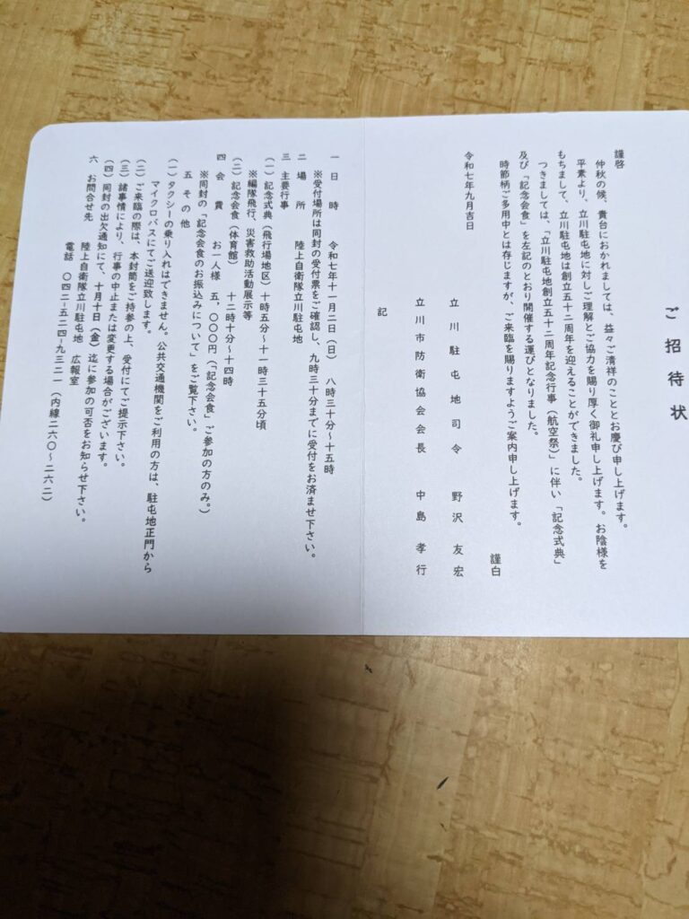 令和7年11月2日(日)に、陸上自衛隊立川駐屯地創立52周年記念行事(航空祭)が行われ、立川駐屯地の野沢友宏司令並びに立川市防衛協会の中島孝行会長よりご招待に預かり、八王子市防衛協会の森上秀男会長が出席いたしました。ご盛会、誠におめでとうございました。