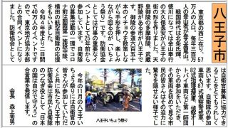 東京都防衛協会会報(第33号)2024年7月1日発行の「活動最前線!地区防衛協会コーナー」におきまして、八王子市防衛協会からは「八王子いちょう祭り」における活動を出稿し、掲載されました。 みなさま、ご高覧のほどお願いいたします。