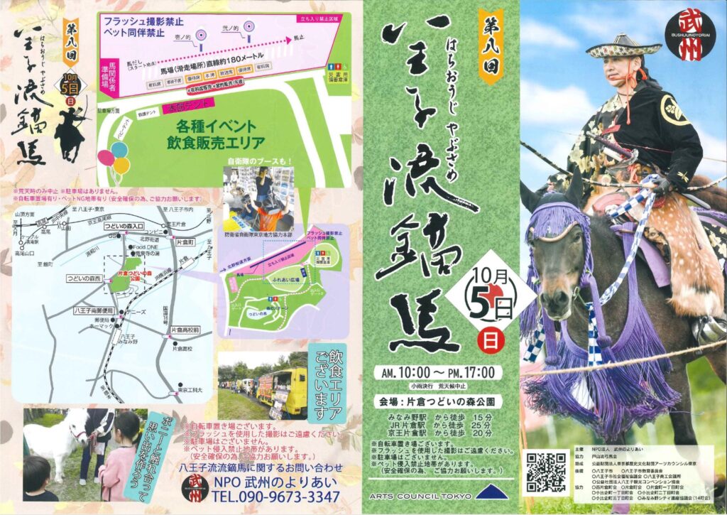 第8回となります八王子流鏑馬が2025年10月5日(日)10時~17時に片倉つどいの森公園で開催されます。お問い合わせはNPO武州のよりあい 090-9673-3347 まで。