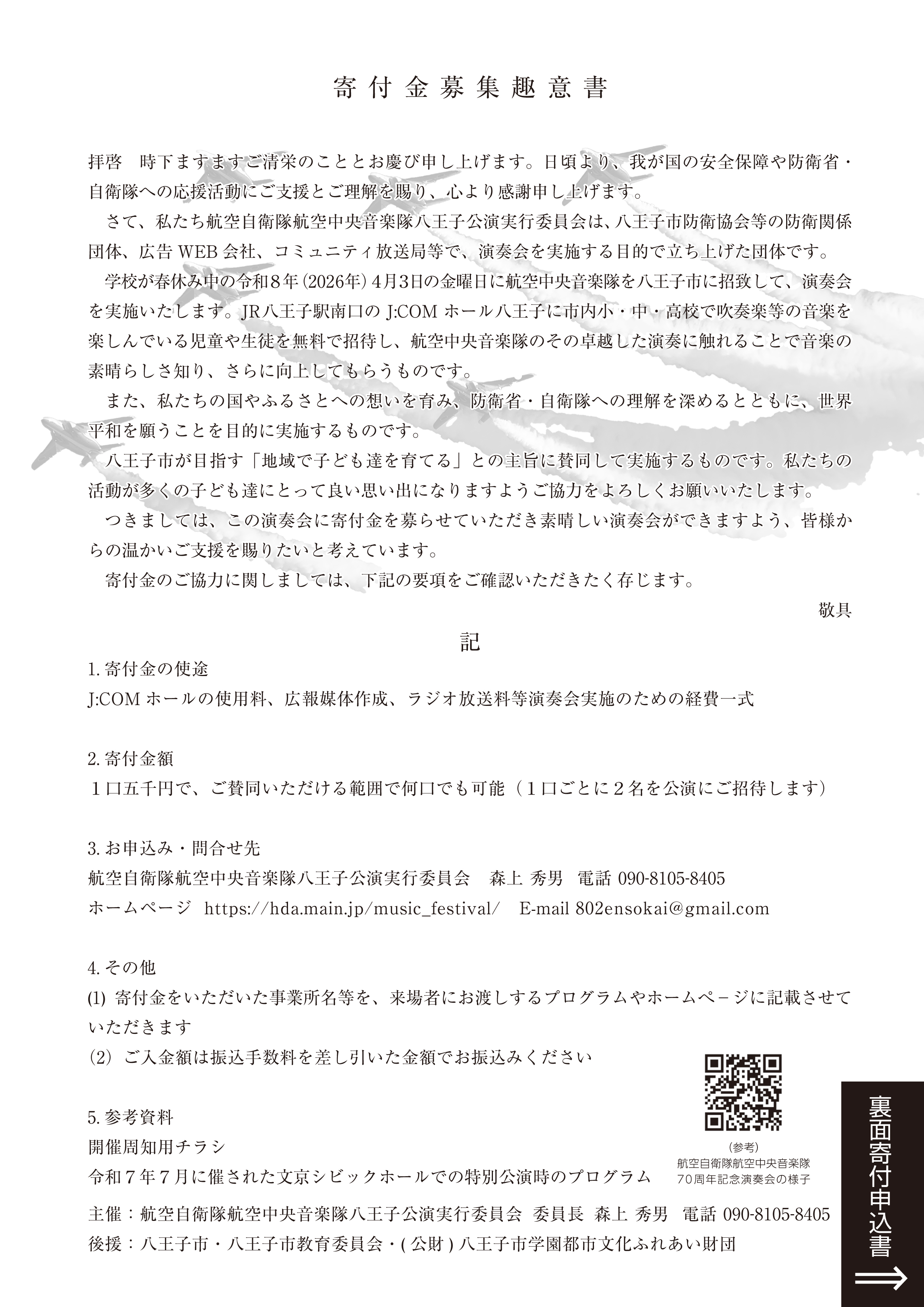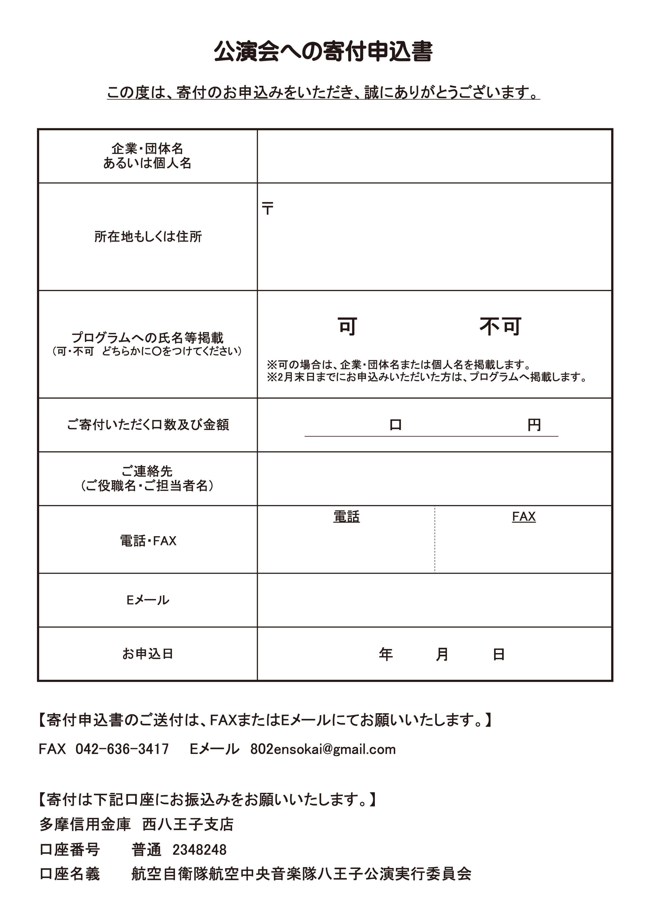 航空自衛隊航空中央音楽隊をJ:COMホール八王子に招致するため、1口5千円からのご寄付をお願い申しあげます。ご寄付いただきました事業所さまは協賛企業として、個人の方は個人協賛として、当サイトならびに当日配布のプログラムにて貴社名・ご芳名を掲載させていただきます。また、本公演の音源を収録して八王子FMで放送する際には、提供スポンサーとして貴社名・ご芳名を紹介させていただきます。なお、協賛1口につきまして八王子公演のご招待券2枚をお渡しさせていただきます。